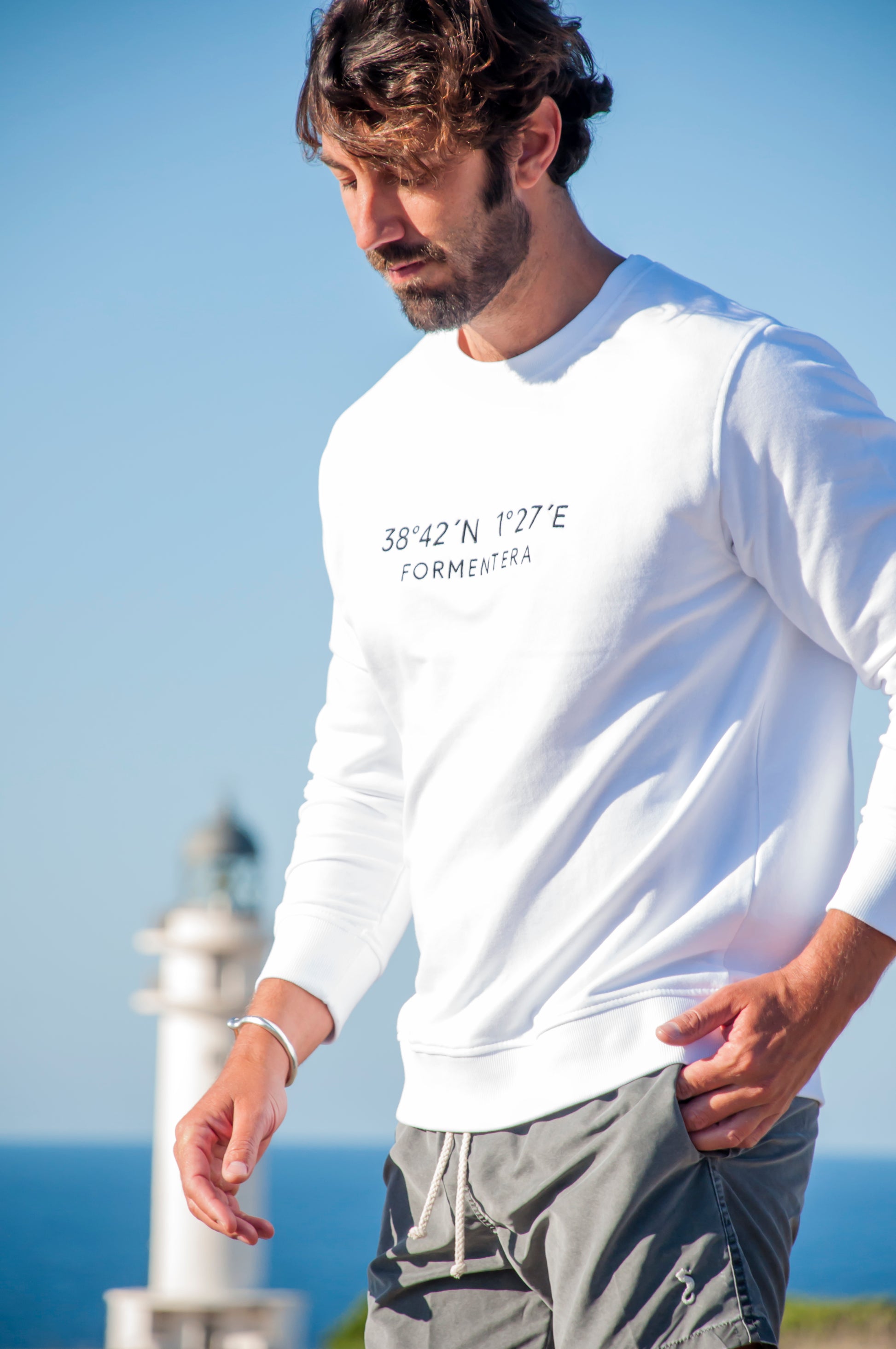 Sweatshirt PUNTA PRIMA Coordenadas. Organic cotton sweatshirt, light unisex with french terry lining. Exclusive design with embroidery of the coordinates of the island of Formentera.