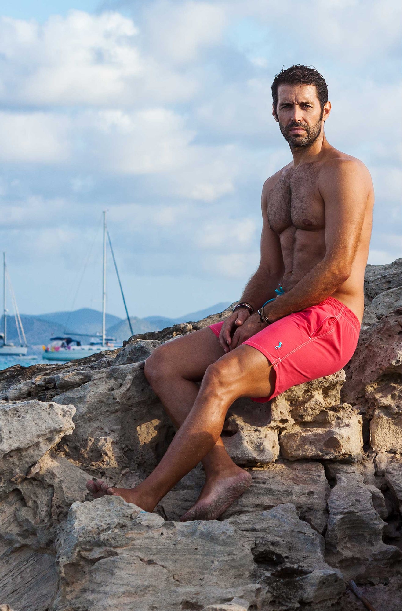 BARBARIA swimsuit. Swimsuit model for men. Its waist is elastic with a drawstring that adjusts for more comfort. Easy access side pockets and back pocket with flap and velcro. Our seahorse is embroidered on the left side in the same tone as the swimsuit cord.