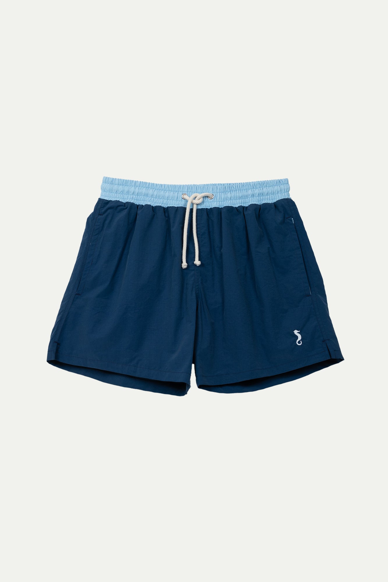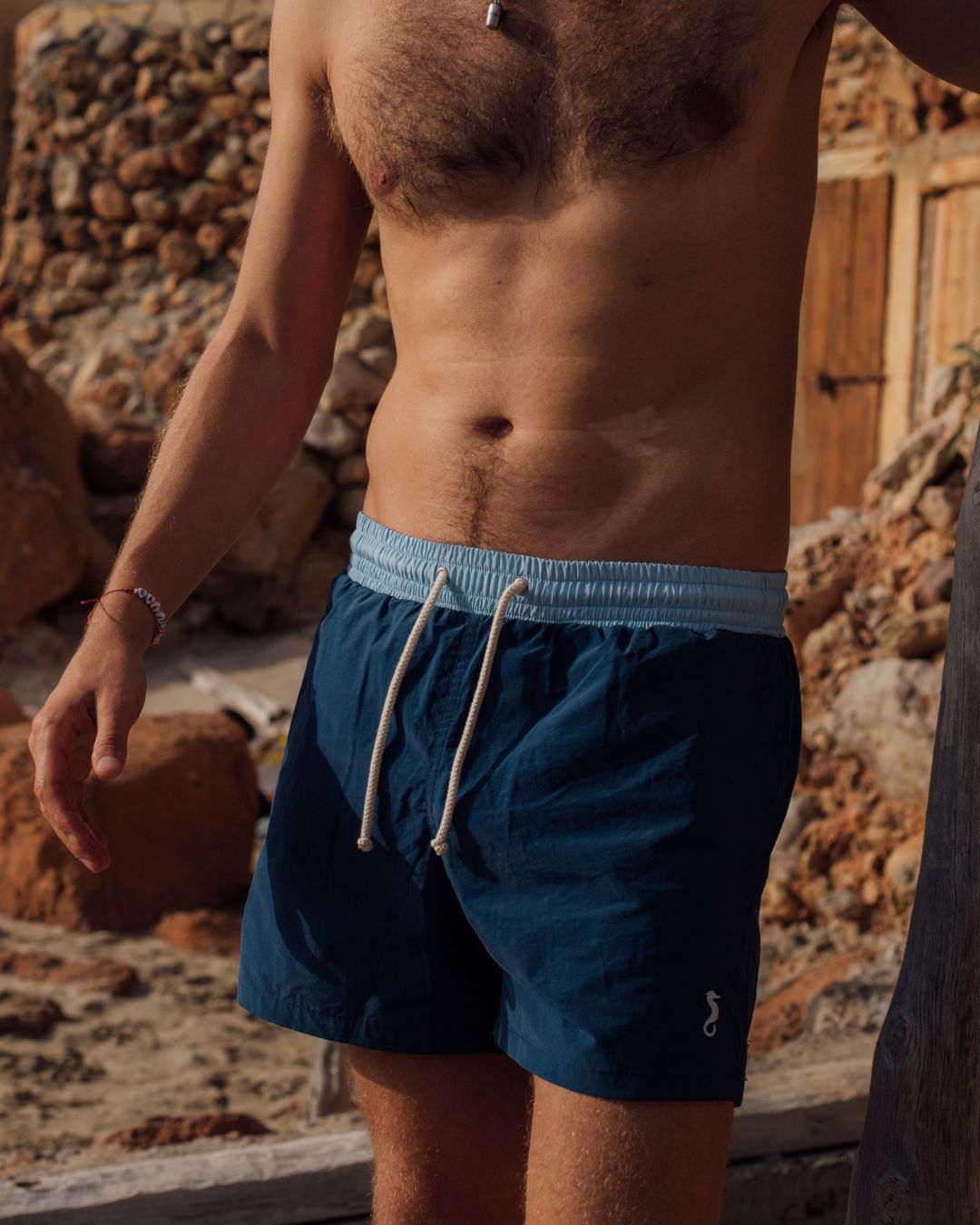 Bañador BARBARIA. Modelo Bicolor de bañador para hombre . Su cintura es elástica con cordón que se ajusta para mayor comodidad, tonalidad diferente a las perneras. Bolsillos laterales de fácil acceso y bolsillo trasero con solapa y velcro. Lleva bordado en la parte izquierda nuestro caballito de mar del mismo tono que el cordón del bañador.