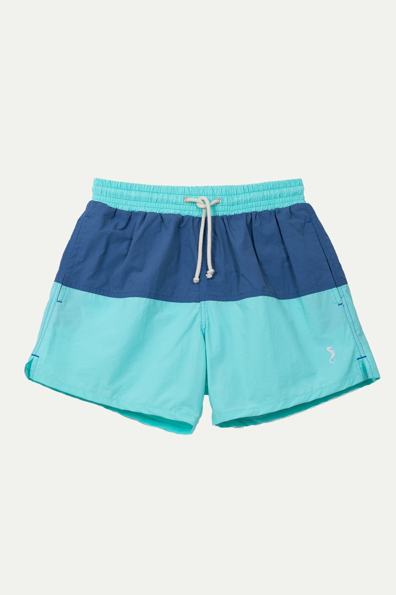 Bañador BARBARIA. Modelo Tricolor de bañador para hombre . Su cintura es elástica con cordón que se ajusta para mayor comodidad, tonalidad diferente a las perneras. Bolsillos laterales de fácil acceso y bolsillo trasero con solapa y velcro. Lleva bordado en la parte izquierda nuestro caballito de mar del mismo tono que el cordón del bañador.