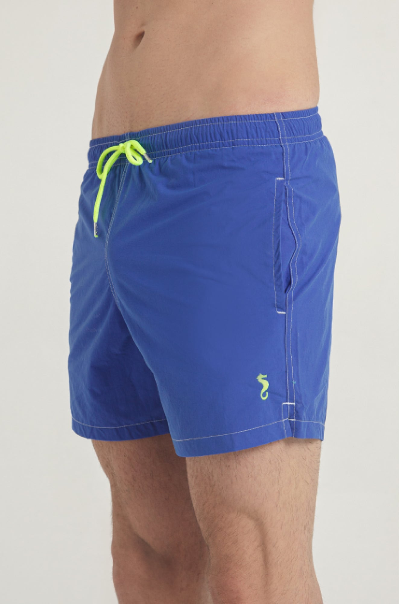 BARBARIA swimsuit. Swimsuit model for men. Its waist is elastic with a drawstring that adjusts for more comfort. Easy access side pockets and back pocket with flap and velcro. Our seahorse is embroidered on the left side in the same tone as the swimsuit cord.
