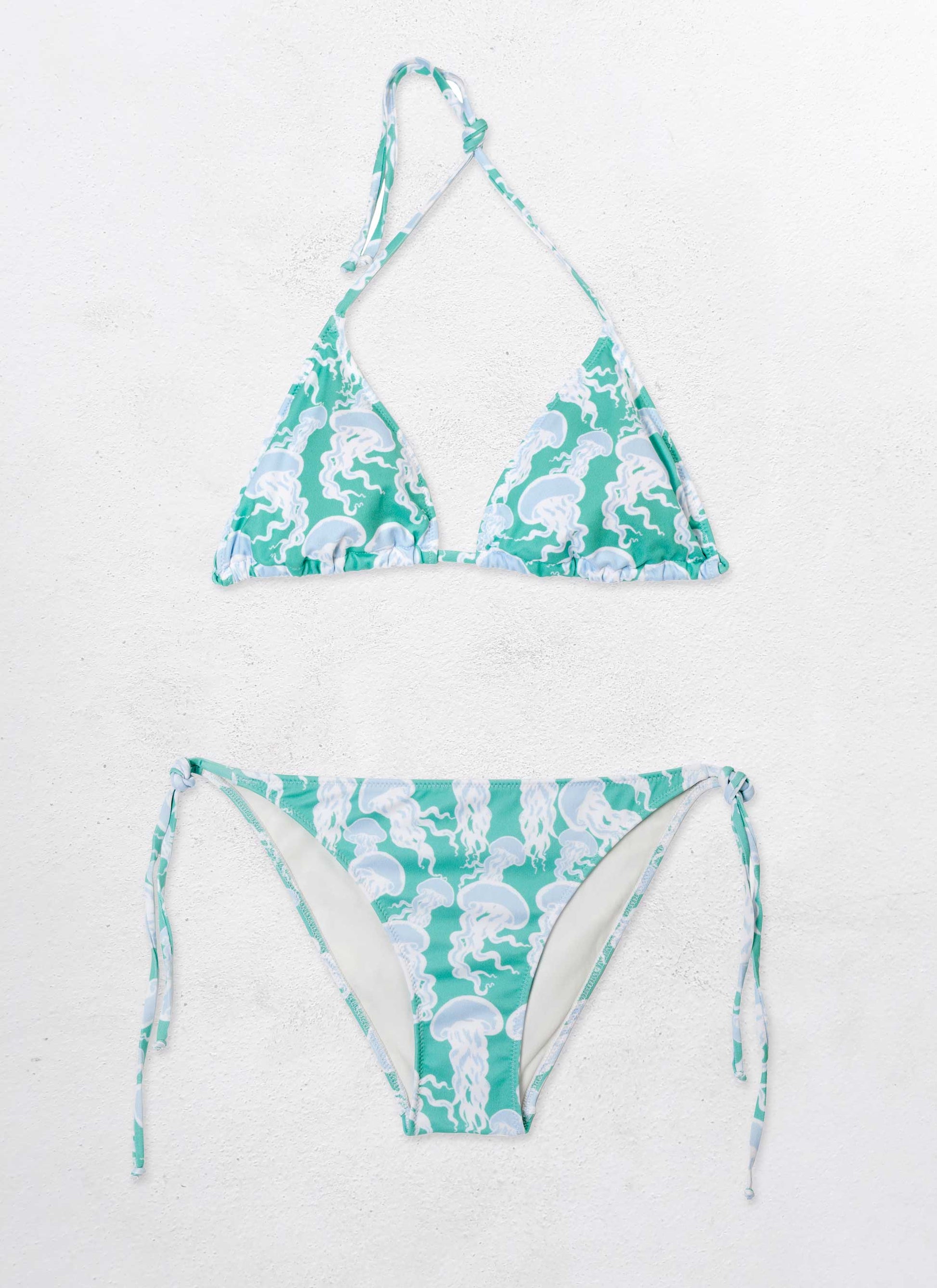 Bikini SA Palmera PUNTA NEGRA with exclusive print by Dossae Formeterara inspired by elements of the island. Fully adjustable triangle top and bottoms with tie closures. It has lining. This model includes removable pans and recycled fabric.