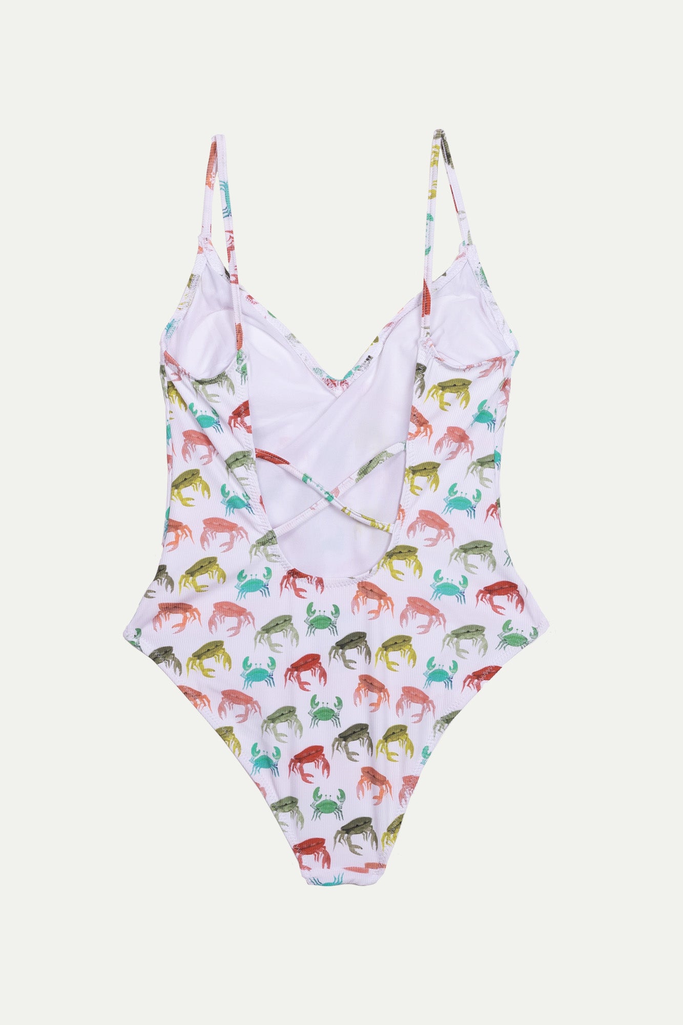 Swimsuit SA Miranda PUNTA NEGRA. Women's swimsuit with exclusive Dossae Formentera print inspired by the island. On the front it has a V-neckline and on the back it has a rounded neckline with two crossed straps that enhances the silhouette of the back. Recycled ribbed fabric. This model includes removable casseroles