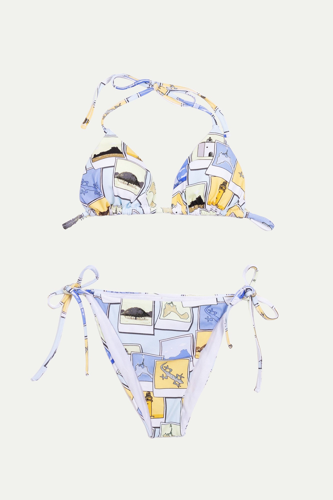 SA Palmera Punta Negra bikini with exclusive Dossae Formeterara print inspired by elements of the island. Fully adjustable triangle top and briefs with tie closures. Recycled ribbed fabric. Lined and includes removable panniers.