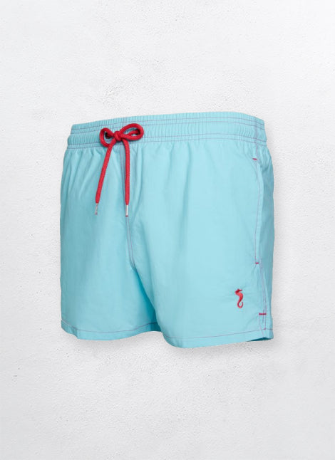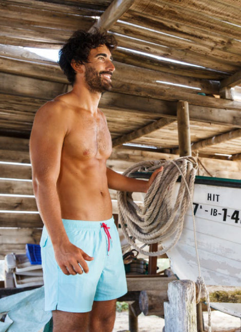 Bañador SAONA. Modelo de bañador corto para hombre. Su cintura es elástica con cordón que se ajusta para más comodidad. Bolsillos laterales de fácil acceso y bolsillo trasero. Lleva bordado por delante nuestro caballito de mar del mismo color que el cordón del bañador.