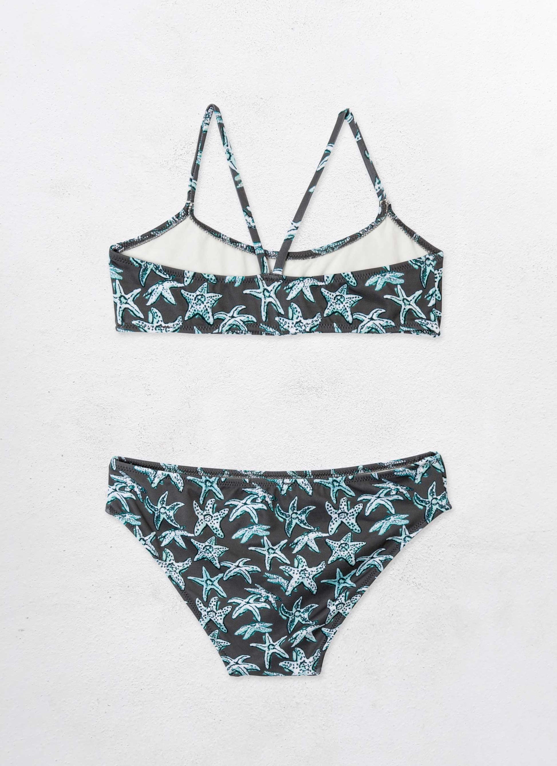 Bikini SA PALMERA ILLETES Kids. Top ancho escote redondo con ribete. Tejido reciclado con estampado exclusivo Dossae Formentera inspirado en elementos de la isla. Lleva forro.